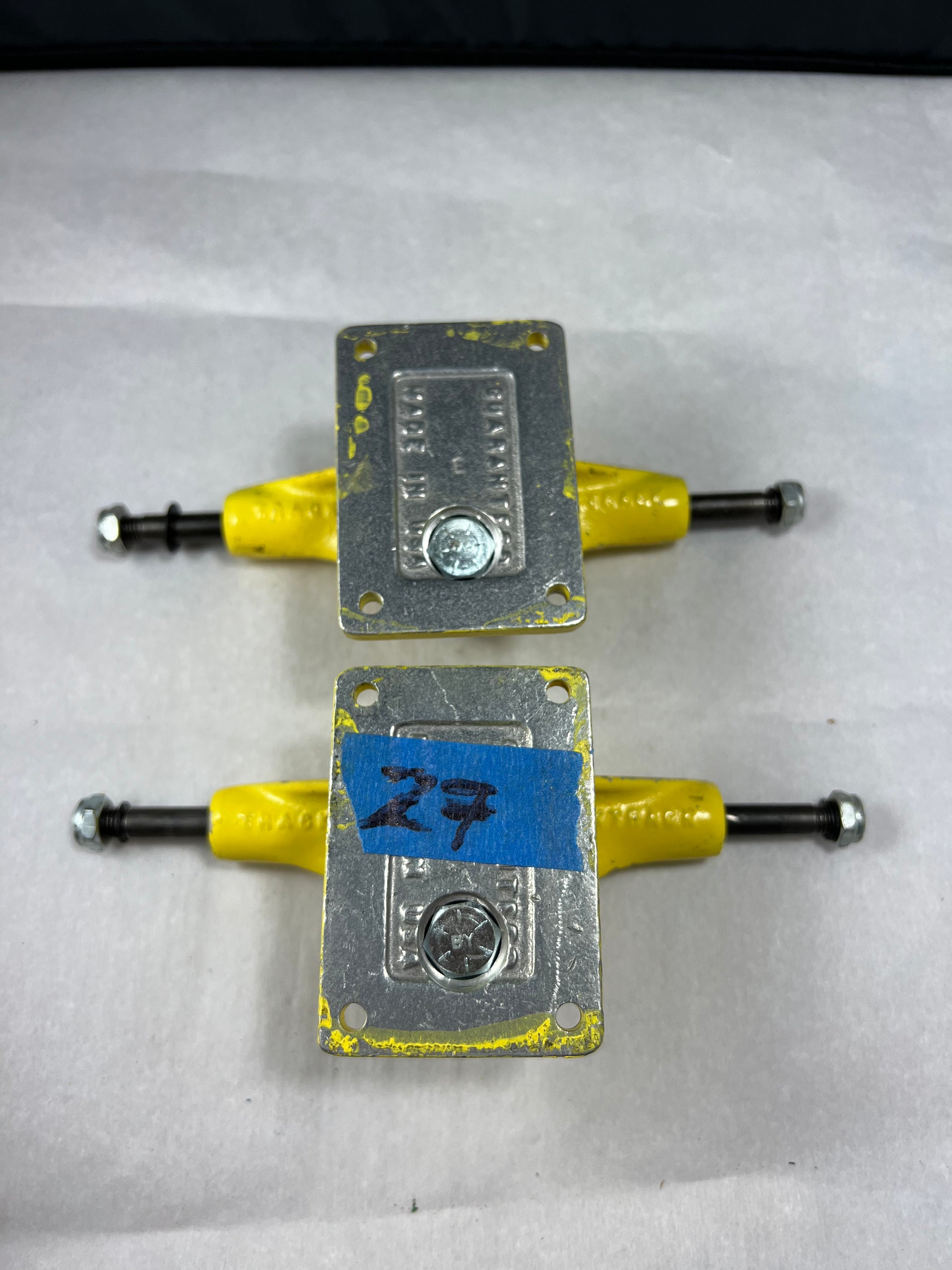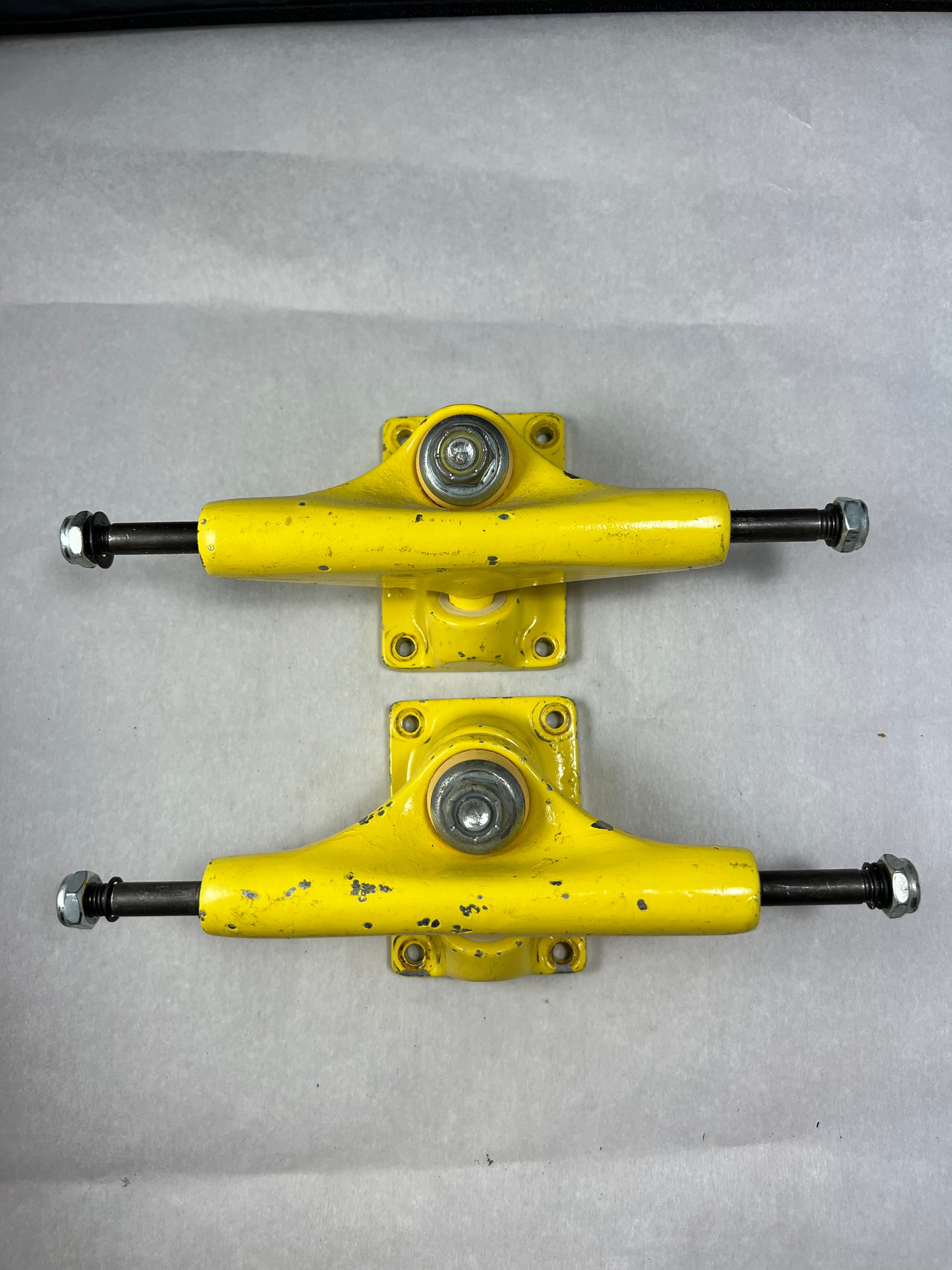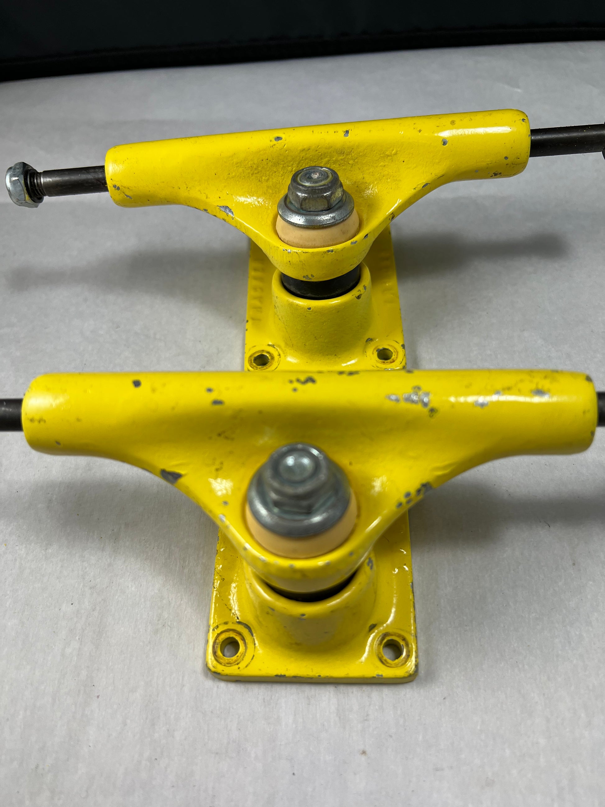 Really nice set of painted yellow Ex-Tracks for your late 70's-early 80s pig. Never ridden just mounted for display in the Museum. Bushings & pivot cups all never turned or ridden. NOTE these are painted. Look at the photos. Bases' bottoms were missed. NOT MAGs.