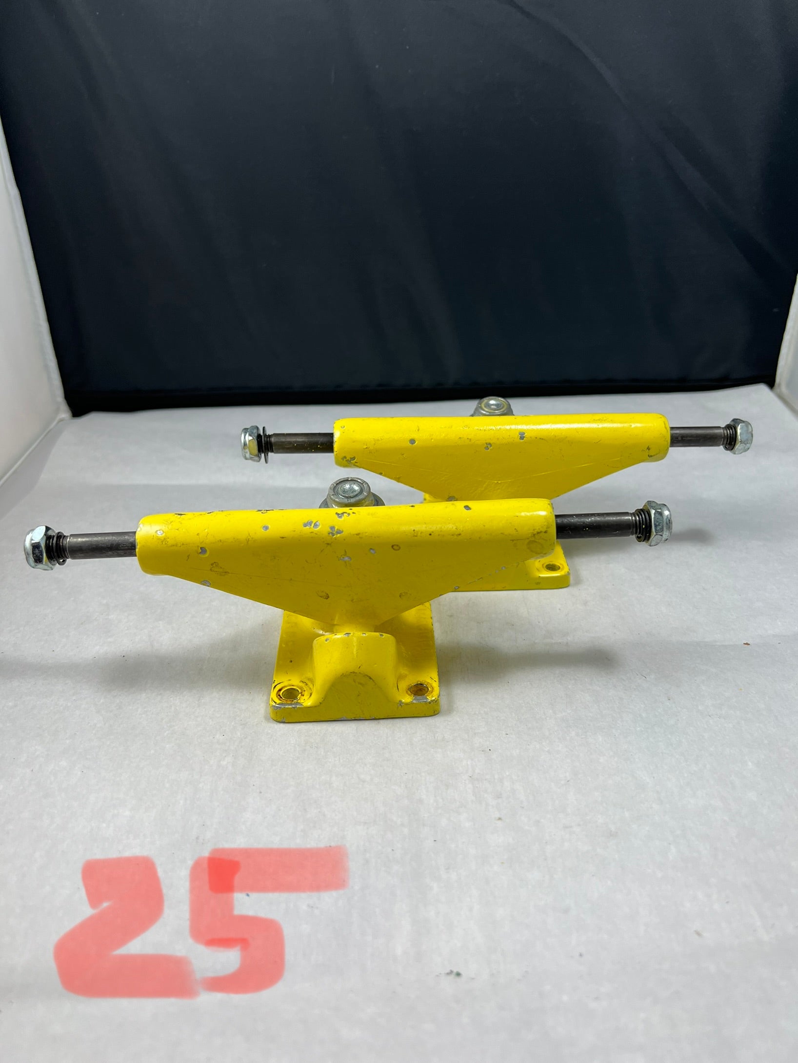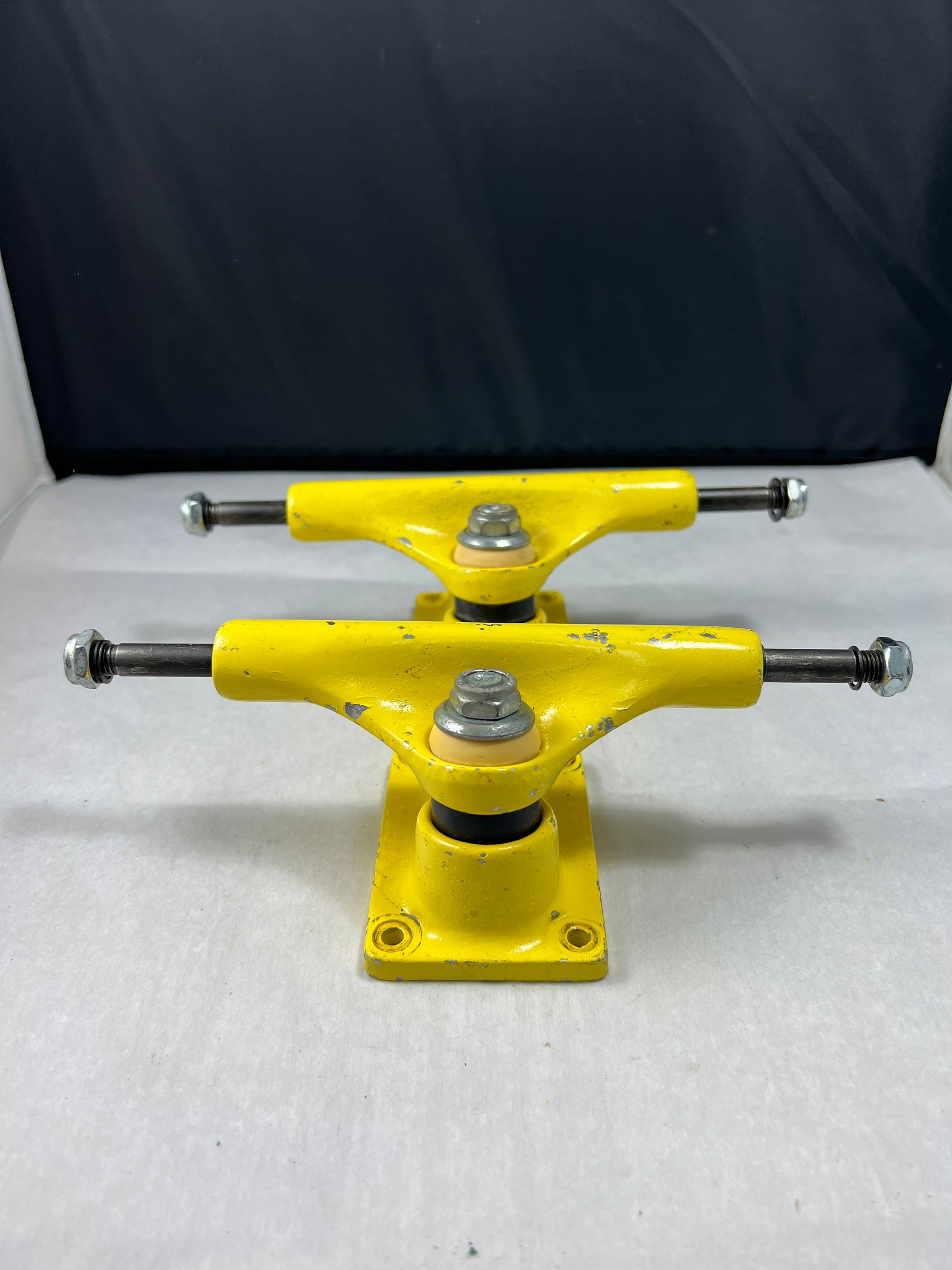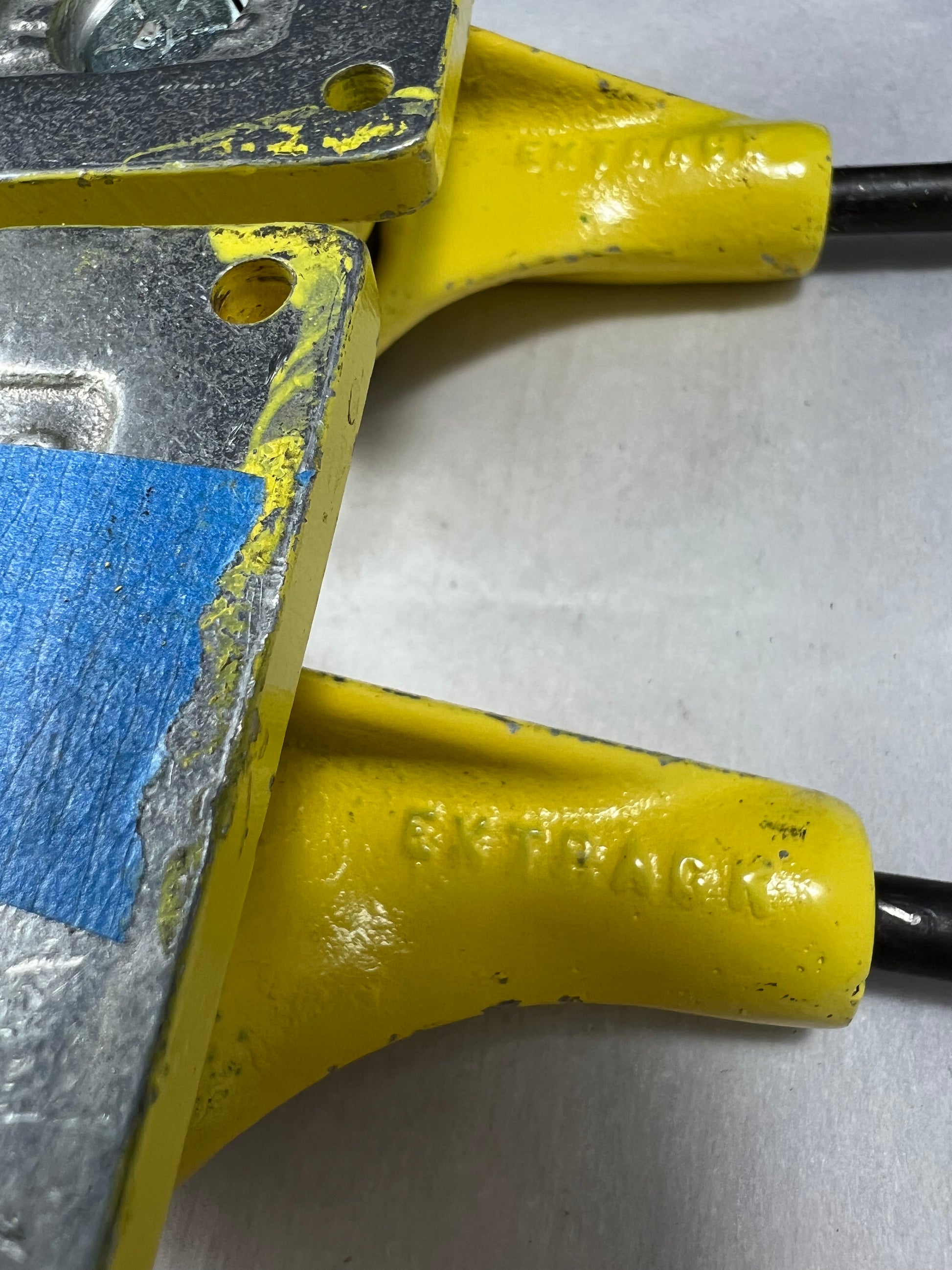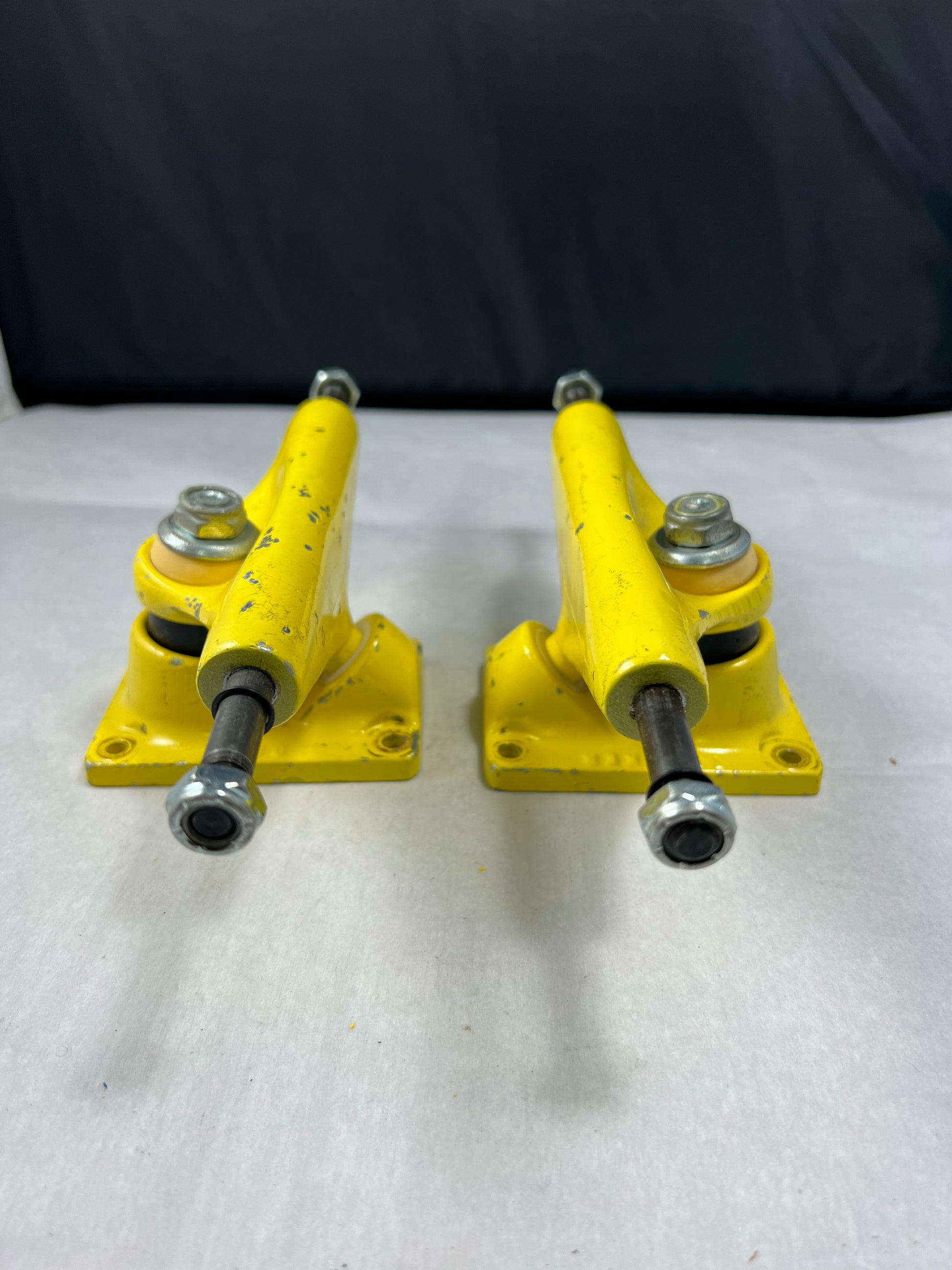 Really nice set of painted yellow Ex-Tracks for your late 70's-early 80s pig. Never ridden just mounted for display in the Museum. Bushings & pivot cups all never turned or ridden. NOTE these are painted. Look at the photos. Bases' bottoms were missed. NOT MAGs.